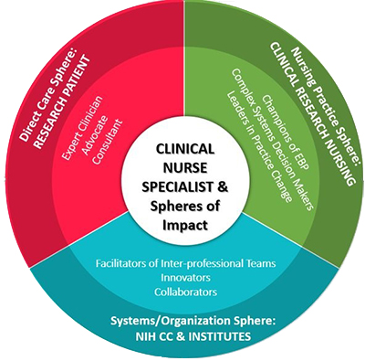 Activities in one sphere interact, impact, and enhance activities in the other spheres. The full impact of the role is demonstrated when a CNS functions in and across all three spheres. Therefore, the role fluctuates at any given time, depending on the needs of the healthcare system, patient care unit, patient/family, or community. While the spheres intersect and overlap, the direct care sphere is the all-encompassing, overarching focus of the CNS role.