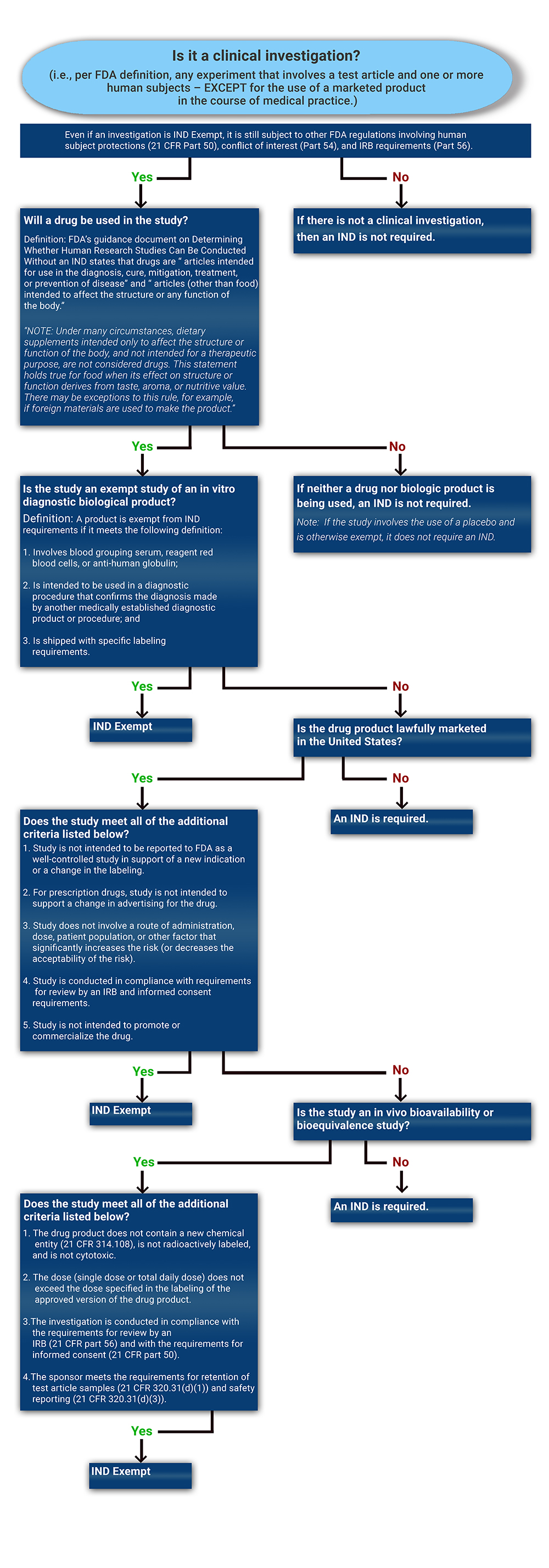 To determine if an IND is required for a clinical study, please start by reviewing the decision tree. The following FDA Guidance document is an excellent source of information that should also be carefully reviewed: Guidance for Clinical Investigators, Sponsors, and IRBs Investigational New Drug Applications (INDs) — Determining Whether Human Research Studies Can Be Conducted Without an IND, September 2013".